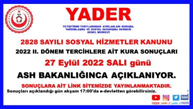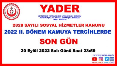 Kıymetli Kardeşlerim, 2828 SAYILI SOSYAL HİZMETLER KANUNU 2022 II. DÖNEM EYLÜL AYI TERCİHLERİNDE 20.09.2022 SALI GÜNÜ SON GÜNDÜR. (Tercih Süresi:…