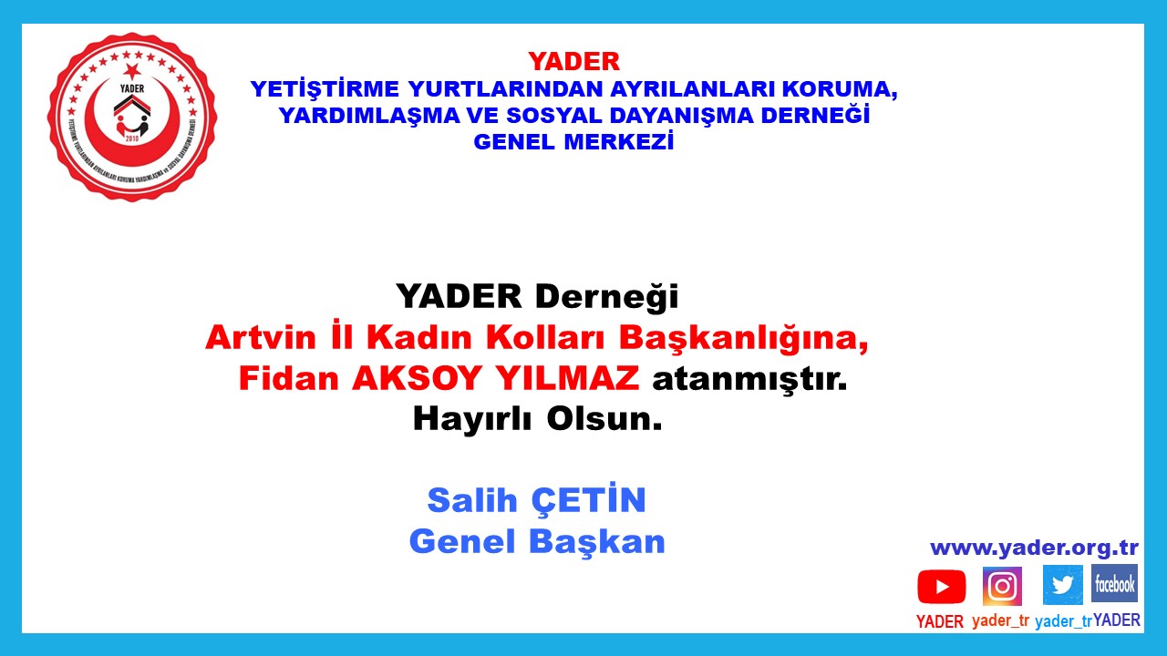 YADER Derneği Artvin İl Kadın Kolları Başkanlığına, Fidan AKSOY YILMAZ atanmıştır. Hayırlı Olsun. Salih ÇETİN YADER Genel Başkanı