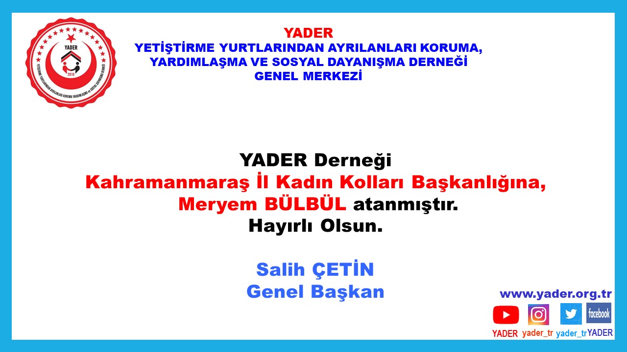 YADER Derneği Kahramanmaraş İl Kadın Kolları Başkanlığına, Meryem BÜLBÜL atanmıştır. Hayırlı Olsun. Salih ÇETİN YADER Genel Başkanı