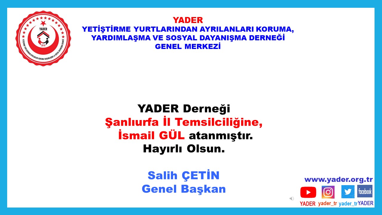 DERNEĞİMİZ ŞANLIURFA İL TEMSİLCİLİĞİNE İSMAİL GÜL ATANDI.