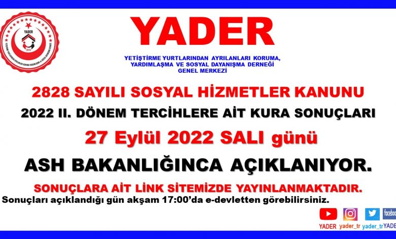 Kıymetli Kardeşlerim,-Aile ve Sosyal Hizmetler Bakanımız Sn. Derya YANIK’ın açıklamaları doğrultusunda kura sonuçlarınız 27.09.2022 tarihinde açıklanıyor.-Aile ve Sosyal Hizmetler Bakanlığınca yapılacak açıklama sonrasında;-2022 II. Dönem Eylül Tercihlerinizin Kura Sonuçlarını 27.09.2022 tarihinde Salı günü akşam 17:00’da aşağıdaki linkten öğrenebilirsiniz.-Bu kura sonuçlarında yerleşemeyenler 2022 Aralık ayında tercih işlemlerini yeniden yapabileceklerdir.İŞE BAŞLAMA SÜRECİ:1) Kurumların web sitelerinde istenilen evrakların açıklanması ve evrak teslimi ortalama 2 haftadır.2) Güvenlik Soruşturması ve Arşiv Araştırması sonuçlanması en fazla 2 ya da 3 ay…