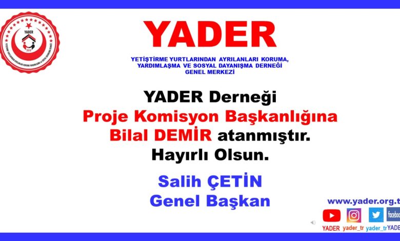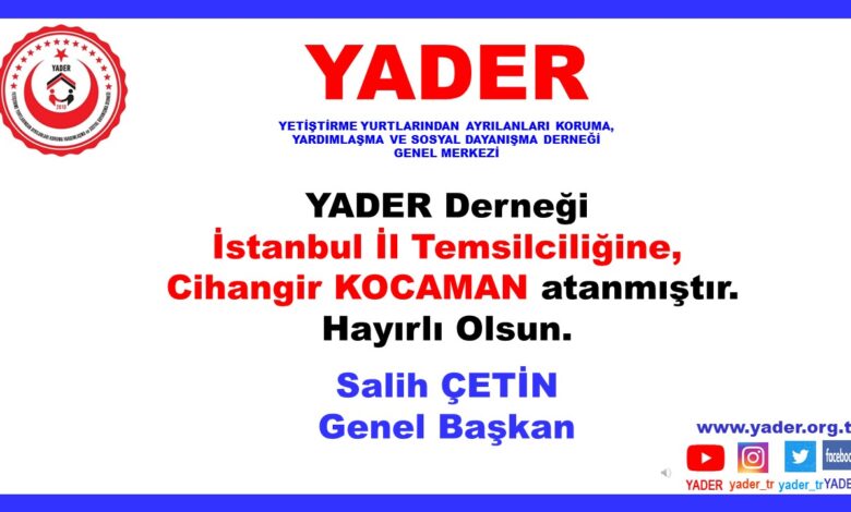 YADER Derneği İstanbul İl Başkanlığına, Cihangir KOCAMAN atanmıştır. Hayırlı Olsun. Salih ÇETİN Genel Başkan