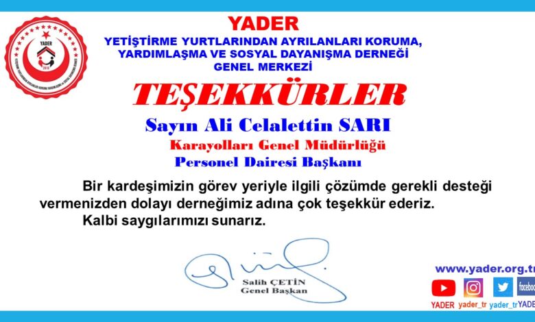 Sn. Ali Celalettin SARI Karayolları Genel Müdürlüğü Personel Dairesi Başkanı Bir kardeşimizin görev yeriyle ilgili çözümde gerekli desteği vermenizden dolayı derneğimiz adına çok teşekkür ederiz. Kalbi saygılarımızı sunarız. Salih ÇETİN YADER Genel Başkanı
